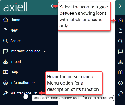 The Main menu displays on the left of the Axiell Collections window at all times: